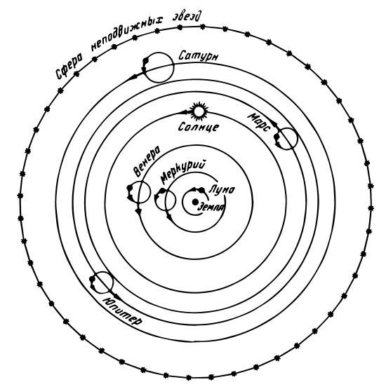 Рис. 4. Система Птолемея. Неподвижная Земля находится в центра мира, планеты движутся по эпициклам, центры эпициклов – по деферентам (орбитам вокруг Земли). У Луны и Солнца эпициклов нет