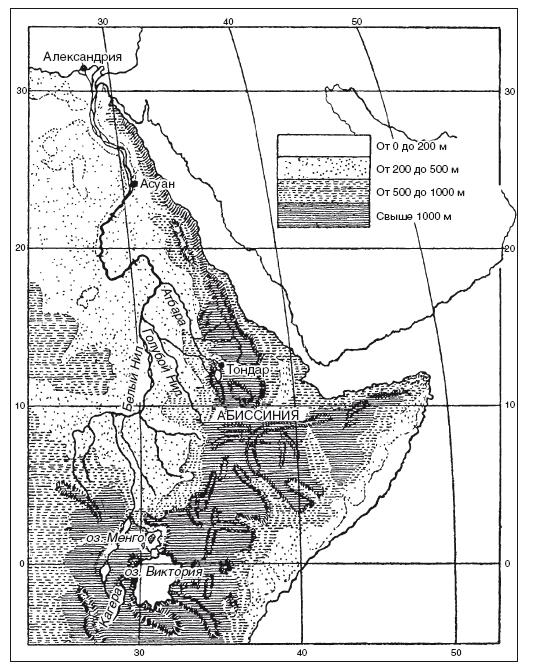 Обратитесь снова к карте. Между 10-м и 20-м градусами северной широты Белый Нил принимает справа большой приток – Голубой Нил. Он стекает с высот Абиссинии, а высоты эти очень значительны. Запомним это.