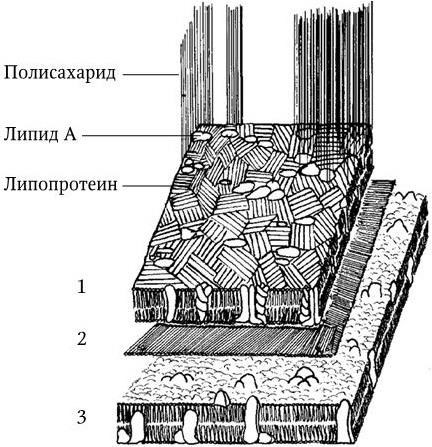Рис. 7. Схематическое изображение структур наружной мембраны (1), пептидогликана (2) и плазматической мембраны (3) E. coli