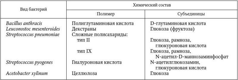 У бактерий различают микрокапсулу, капсулу и слизистый слой. Микрокапсула выявляется при электронной микроскопии в виде коротких мукополисахаридных фибрилл. Ее роль и значение не совсем ясны. Капсула представляет собой слизистый слой, который обычно сохраняет связь с клеточной стенкой. Капсула служит внешним покровом бактерий, толщина ее более 0,2 мкм, она четко обнаруживается под микроскопом после негативного окрашивания, например по способу Бурри – Гинса (см. цв. вкл., рис. 10). Капсулы, в связи с их гелеобразной консистенцией, плохо удерживают красители, поэтому для их обнаружения наиболее приемлем метод негативного контрастирования. Макромолекулы капсулы сильно гидратированы, расположены рыхло и не препятствуют поступлению веществ в клетку и выходу продуктов ее метаболизма наружу. В образовании капсулы принимает участие ЦМ. По химическому составу различают капсулы, состоящие из полисахаридов, не содержащих азота; полисахаридов, содержащих азот (аминосахара); капсулы полипептидной природы (табл. 3). Капсулу полипептидной природы образуют несколько видов Bacillus, она у них состоит из D-глутаминовой кислоты, и Y. pestis.