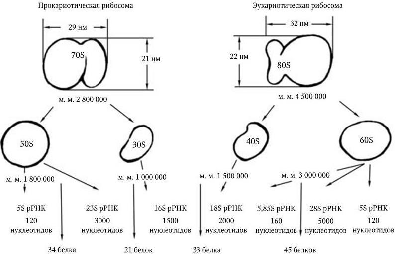 Рис. 20. Схематическое изображение структур прокариотических и эукариотических рибосом