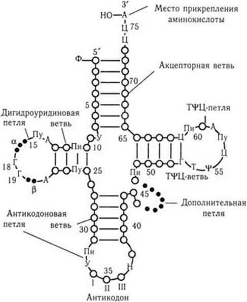 Рис. 22. Обобщенное изображение молекулы тРНК в виде клеверного листа, характерное для неинициаторных тРНК