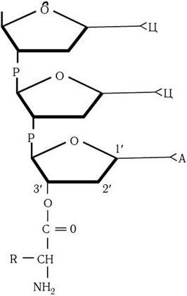 1. С помощью специального фермента (аминоацил-тРНК-синтетазы) тРНК присоединяет на одном из своих концов соответствующую аминокислоту, в результате чего возникает лабильное соединение – аминоацил-тРНК (аа-тРНК) – акцепторная функция тРНК.
