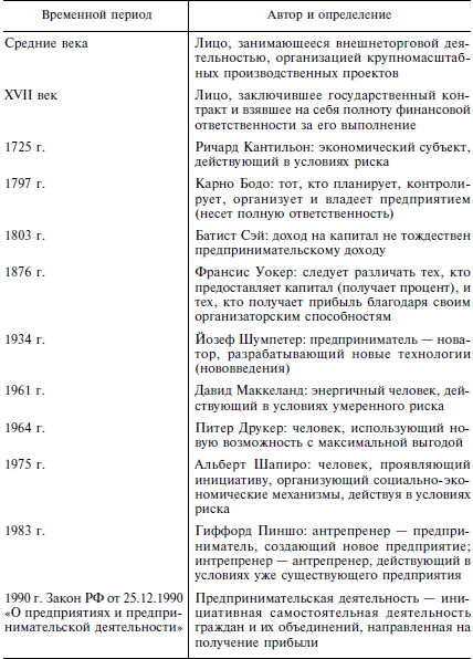 В экономической теории понятия «предпринимательство» и «предприниматель» появились в XVIII веке, в эпоху капитализма. Учеными-экономистами эпохи капитализма дается первое систематическое, научное описание этих категорий. Так, родоначальником научного понятия «предпринимательство» явился английский экономист Р. Кантильон (1680–1730), который в своей работе «Опыт о природе торговли вообще» (1725) рассмотрел предпринимательство как особый вид деятельности, связанный с элементами риска. Согласно Р. Кантильону, предприниматель есть особый субъект, наделенный способностями предвидеть, рисковать, брать на себя всю полноту ответственности за принимаемые решения.