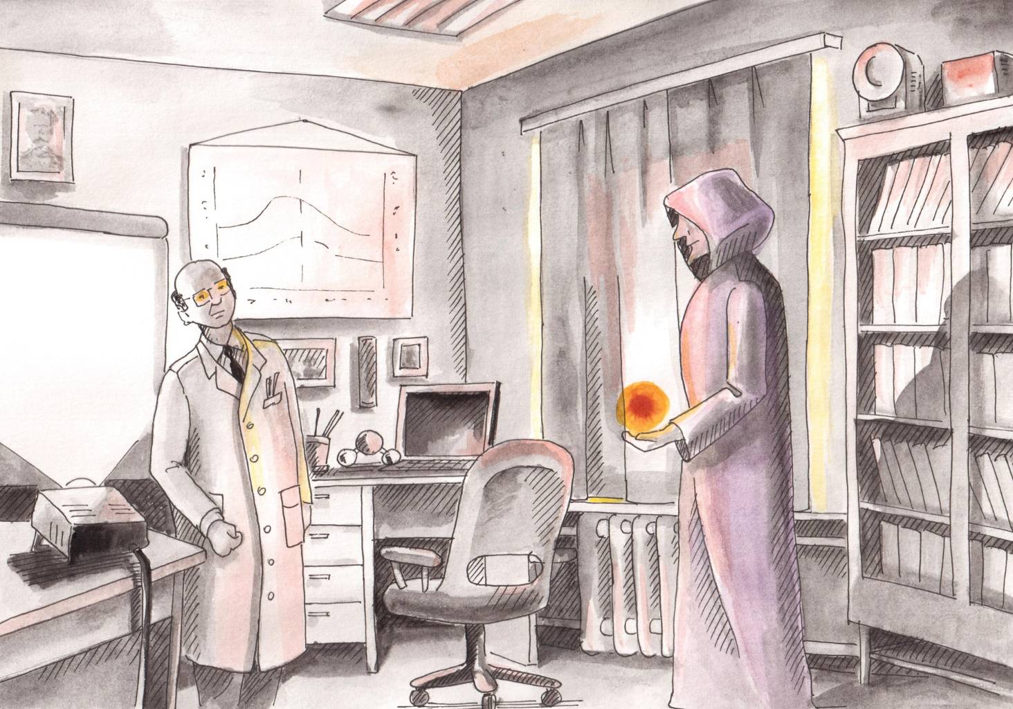 В тот же момент, как это произошло, дверь распахнулась, и в кабинет вошли коллеги профессора, которых он отправил на десятиминутный перерыв. Внутри никого не было, только проектор продолжал работать, освещая прямоугольником белый экран. Девушка с хвостом на голове щелкнула настенным выключателем, и в кабинете стало светло.