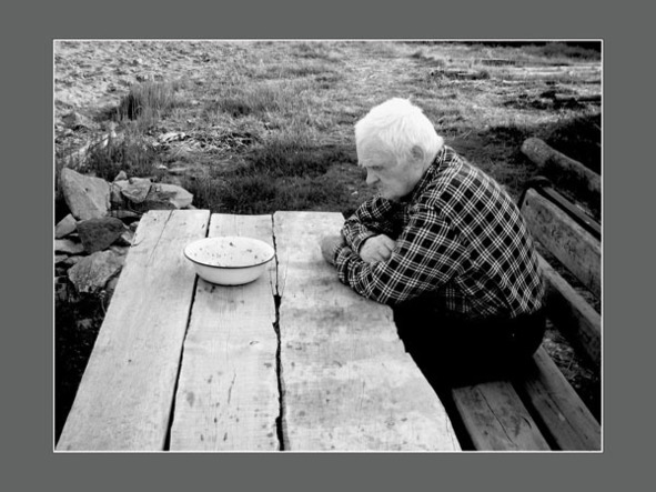 Белая миска на простом столе, белая седая голова. Усталость и молчание. Человек остается один на этом последнем пути, которого никому не избежать.