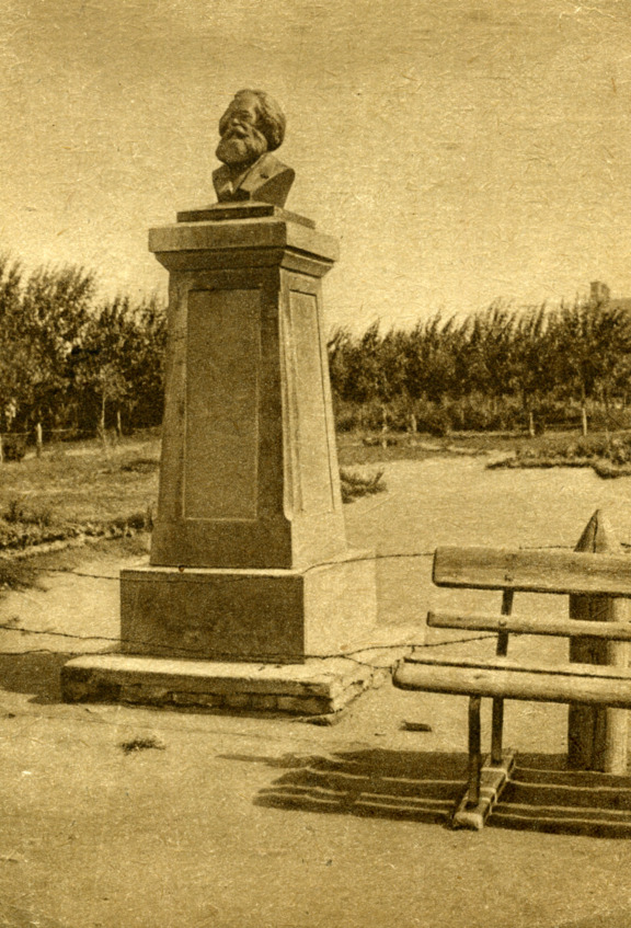 На другой открытке того же времени – памятник Карлу Марксу. Стоял он там, где сейчас сквер танкистов у почтамта. «Не устоял» вовсе не по идейным соображениям: видимо, потому что был сделан из временного материала – из гипса.