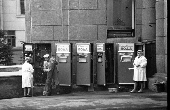 Там, в детские годы, на улицах города были такие автоматы с газированной водой. Особых лакомых напитков в те годы не было, поэтому выпить стакан газводы было маленьким приятным событием.