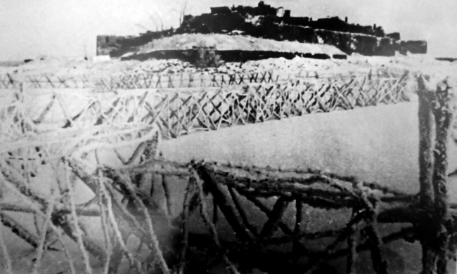Перед первой траншеей на расстоянии 5 и 10 м имелось две линии проволочных препятствий типа спираль Бруно. Причем передний от противника ряд представлял собой обычную спираль Бруно из толстой колючей проволоки, а второй – из гладкой проволоки, подвешенной на колючую проволоку, прикрепленную к специальным железным штырям (высотой 1,2 м, диаметром 15 мм), вбитым в землю через каждые 4–5 м. За траншеей на расстоянии 10–15 м был установлен второй ряд проволочных заграждений типа спираль Бруно (3, л. 8).