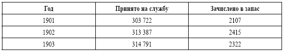 Как указывалось выше, население Российской империи на 1900 г. составляло около 133 миллионов человек, из которых 29,7 миллиона составляли мужчины в возрасте от 20 до 40 лет. Общий призыв составлял в России весьма значительную цифру – в 1900 г. 1 миллион 23 тысячи человек, из них были зачислены на действительную службу 292 803 человека.