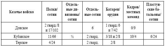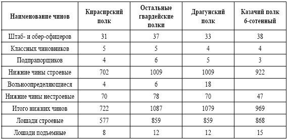 Кавалерия. В Европейской России и на Кавказе кавалерия состояла из 19 кавалерийских дивизий (№ 1—2 гвардейские, № 1—15 армейские, Сводная и Кавказская), 4 казачьих дивизий (1-й Донской, Казачьей сводной и № 1—2 Кавказских казачьих), 3 отдельных кавалерийских бригад (гвардейской и № 1—2 отдельных) и Финского драгунского полка. 1-я гвардейская состояла из 6 полков: кавалергардского, л.-гв. конного, двух кирасирских – «Её Величества» и «Его Величества», 2 гвардейских казачьих полков и л.-гв. Уральской сотни, сведенных в три бригады. 2-я гвардейская: л.-гв. конно-гренадерского, л.-гв. уланского «Его Величества», л.-гв. драгунского и л.-гв. гусарского полков, сведенных в две бригады. Армейские кавалерийские дивизии состоят из 3 драгунских и казачьего полка каждая, каждый полк в составе 6 эскадронов (сотен). Казачьи дивизии имеют 4 полка по 6 сотен. Гвардейские кирасирские полки состоят из четырех эскадронов. Эскадрон делится на 4 взвода по 16 рядов. Все армейские драгунские полки имеют общую нумерацию с 1-го по 55-й. Всего регулярных полков: 10 гвардейских и 55 армейских— 382 эскадронов.