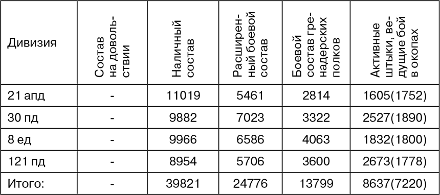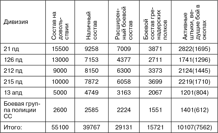 Следует отметить известную вольность использования термина Gefechtstärke в немецких документах, так в отчете о боевых действиях 126 пд он обозначает численность только пехотных батальонов. По этой причине автор дал в таблицах численности пехотных дивизий, в скобках численность личного состава пехотных батальонов.