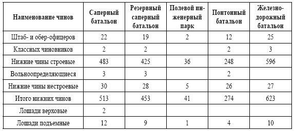 Инженерные войска. В Европе и на Кавказе инженерные войска состояли из 25 саперных (гвардейский, гренадерский № 1—21 армейские и № 1—2 кавказские), 8 понтонных и 4 железнодорожных батальонов. Имеется 7 полевых инженерных парков. Вышеперечисленные части были сведены в 7 саперных и железнодорожную бригады. Саперные батальоны включали 3 саперные и военно-телеграфную роты. Саперным батальонам придавался легкий мостовой парк. Военно-телеграфная рота имела 85 км провода; при мобилизации разделялась на 3 отделения: 2 шестовых – по 25 км и 1 кабельное – 35 км провода (для устройства сообщения в сфере огня). Понтонные батальоны состояли из 2 рот, каждый батальон мог построить мост 105 саженей (230 метров) длины. Из железнодорожных батальонов один имел 4-ротный состав, остальные три (образующие железнодорожную бригаду) – 5 рот. Пятые роты при мобилизации отделялись для формирования резервных железнодорожных батальонов. Полевые инженерные парки (подвижные запасы шанцевого инструмента) подразделялись на корпусные отделения, соответствующие потребностям 2 пехотных и 1 кавалерийской дивизий и 1 саперного батальона. Всего 25 отделений (2 осадных инженерных парка, каждый по 4 отделения), каждое с принадлежностями для осады одной крепости.