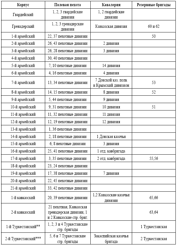 В Европе и на Кавказе войска сводились в 27 корпусов: гвардейский, гренадерский, № 1—21 армейские, № 1—2 Кавказские и № 1—2 кавалерийские. В состав корпусов не включались: казачья дивизия, 6 стрелковых бригад, инженерные войска и ряд мелких частей.