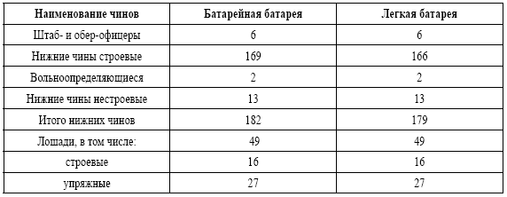 Батареи имели в своем составе зарядные ящики: легкие и конные – по 12, батарейная – по 16, мортирная – по 18 и 6 двуколок; в горной батарее – 128 вьючных зарядных ящиков.