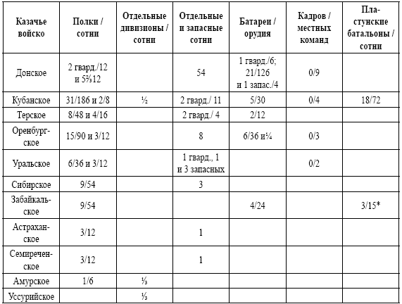 Казачьи войска выставляли конницу, конную артиллерию и пехоту. Число пехотных частей незначительно – 6 пластунских батальонов выставляемых Кубанским казачьим войском.