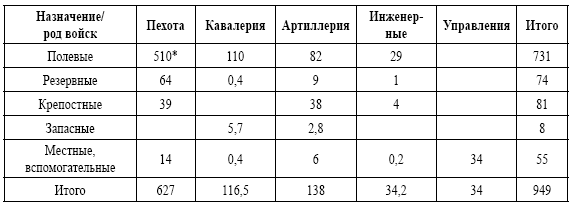 Русская армия на рубеже столетий накопила запас обученных военному делу людей, благодаря чему могла увеличить миллионную армию мирного времени в 2,5 раза. В случае войны под знаменами находилось свыше 2,5 млн человек. Вместе с тем структура армии была громоздкой. Имелось несколько категорий войск: полевые, резервные, крепостные и так далее. Штаты частей и соединений были весьма разнообразны. В пехоте роты содержались в одиннадцати различных составах. Артиллерийские бригады имели 4—9 батарей, то есть 32—72 орудий. Количество рот в батальонах – полевых, резервных, крепостных – колебалось от 4 до 10. Полки были в 4, 3 и 2 батальона. Все это усложняло мобилизацию и развертывание войск.