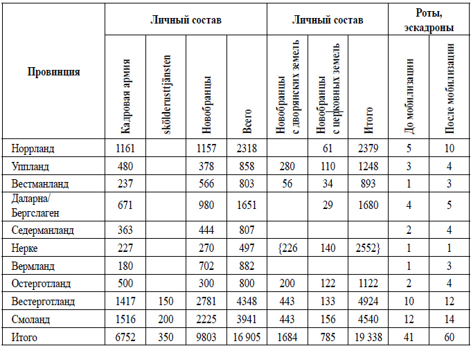 В 1611 г., незадолго до начала войны с Данией, численность шведской национальной армии была наименьшей. Сохранились списки, содержащие данные о численности армии до и после призыва в 1611 г. (их можно найти в прилагаемой ниже таблице). Они показывают, что пехота состояла из 41 роты (7102 солдата), т. е. в среднем 173 пехотинца в роте. Благодаря призыву, объявленному риксдагом в Эребру в декабре 1610 г., в армию было призвано 9803 человека из числа крестьян, около 1650 – по frälse (освобождение дворянства от налогов) и 785 – из набора под руководством духовенства. Всего пехота насчитывала 16 905 человек – не считая набора, осуществленного по frälse и духовенством. Это означало, что система всеобщего призыва в армию с честью выдержала это трудное испытание.