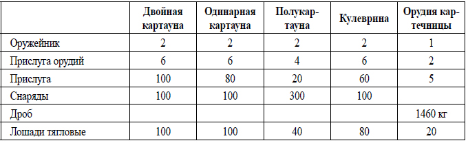 Приведенная таблица отражает количество прислуги и боеприпасов орудий в XVI в. В ней приведены данные похода принца Карла в Кальмар в 1598–1599 гг. Артиллерия состояла из: 2 двойных картаун, 2 одинарных картаун, 12 полукартаун, 2¾ кулеврин (notslangor) и 2 «новоотлитых пушек, стреляющих дробом»[28].