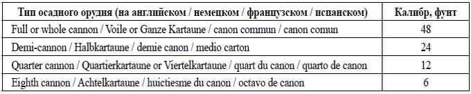 Каждый класс артиллерии был разделен на четыре стандартных калибра. В качестве базового калибра для осадной артиллерии использовался 48-фунтовый, а для полевой артиллерии – 24-фунтовый. В дополнение к 48-фунтовому орудию испано-голландская артиллерийская система предусматривала дальнейшее использование старого Doppelkartaune, или двойной картауны, 96-фунтового калибра, которое было очень трудно передвигать. Однако вскоре выяснилось, что даже 48-фунтовые орудия слишком тяжелы для удобной эксплуатации. Также было обнаружено, что 24-фунтовый снаряд не только легче, проще в перемещении и занимает меньше места, чем 48-фунтовый, но и потребляет меньше пороха и имеет более высокую скорострельность, при этом производит почти такое же воздействие на каменную стену. Отныне 24-фунтовый калибр стал стандартным для осадных орудий, и это положение сохранялось до конца XIX в., когда он был окончательно вытеснен современной нарезной артиллерией.