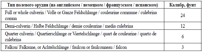 – полевых кулеврин (fältslangor) – одинарных, ¾, ½ и ¼ массой 1500—500 кг.