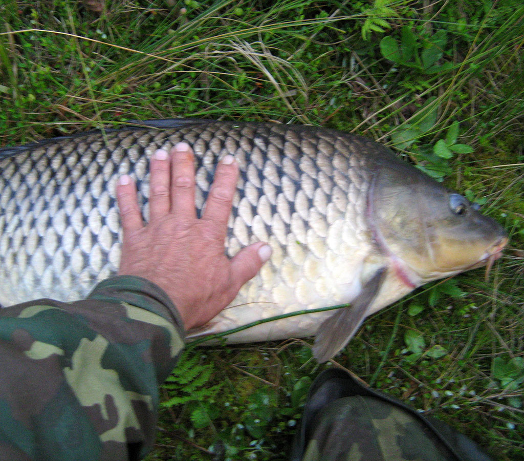 Нехарактерная поклёвка, но я всё же сделал длинную подсечку за спину. Зацепил будто за бревно, но вот появилось движение, и это был, несомненно, карп, хотя вёл он себя как-то странно. После десятиминутного сопротивления сдался, правда, застрял между кочкой и берегом. Подвести под него сачок не было возможности, пришлось брать руками.
