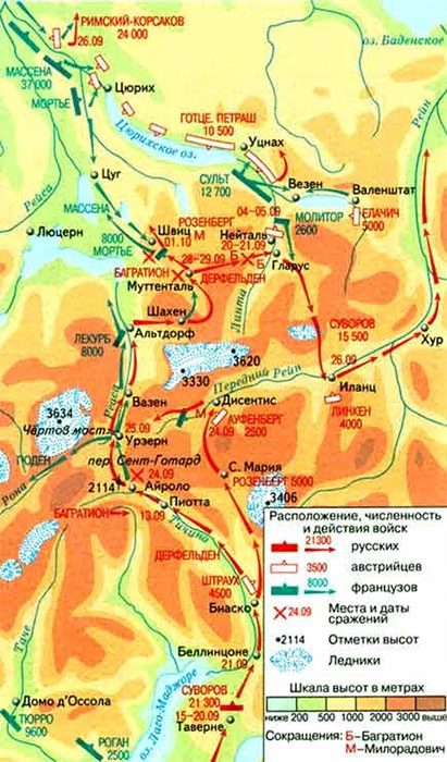 На этом фоне чуть ли не единственной хорошей новостью становится приказ российского императора от 7 сентября, в котором нашему фельдмаршалу предписывается «соединить в Швейцарии Мои войска и действовать оттуда куда и как заблагорассудите, независимо от Це́сарцев [то есть австрийцев] /…/ Но как скоро достоверно вы бы узнали /…/, что Венский Двор приступает к заключению с Францией /…/ мира /…/, тогда /…/ изберите одно из двух /…/: или оставшись в Швейцарии, продолжать /…/ войну самим собою, или приняв нужные меры, обратиться с армией вашей к России[62]»[63]. По крайней мере, отныне наш военачальник может вести боевые действия, полагаясь лишь на свой собственный опыт.