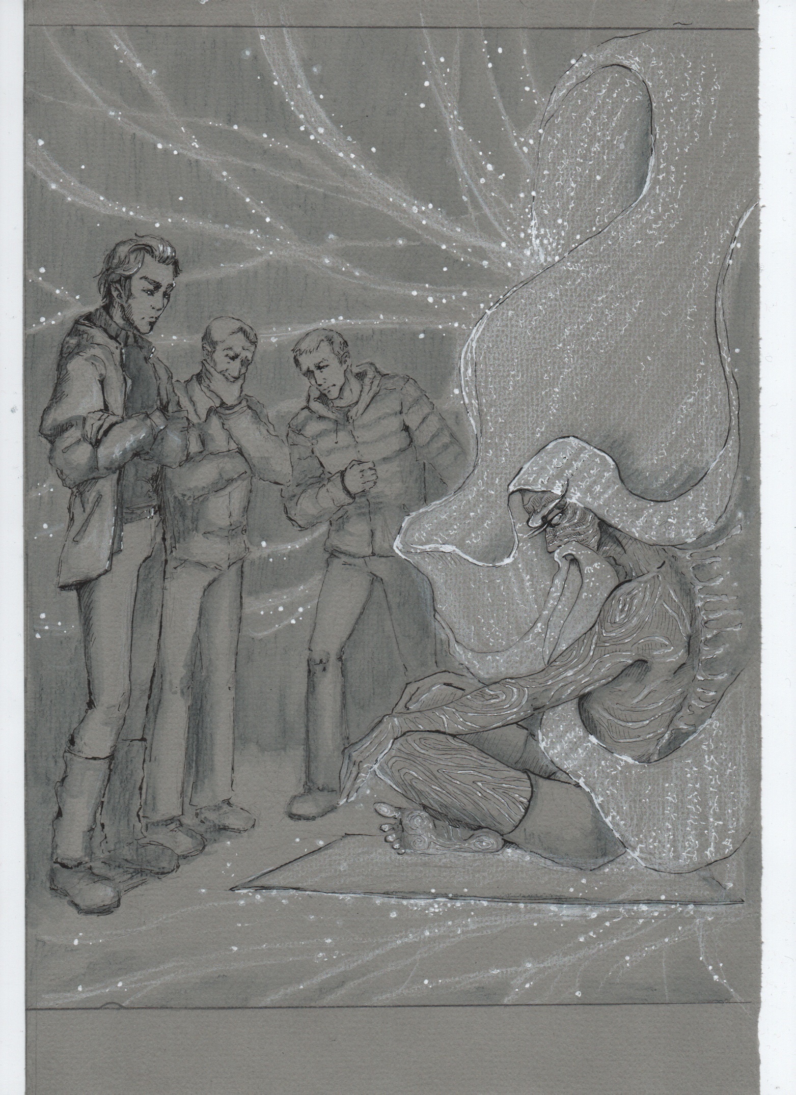 Тарас Петрович, Фёдор и Георгий робко сделали шаг внутрь комнаты. Внутри не было абсолютно ничего. На гладком белом полу лежала циновка, на ней в позе по-турецки сидел Великий Правитель. Выглядел он примерно, как Ивраоскарь. Был сплошь покрыт бороздками, похожими на татуировки, и по этим бороздкам то и дело пробегали яркие, озорные огоньки. Из одежд на нём были только штаны, очень короткие, повторяющие контуры тела. Вместо волос широкая полоса неизвестных символов, которые также периодически подсвечивались в хаотичном порядке.