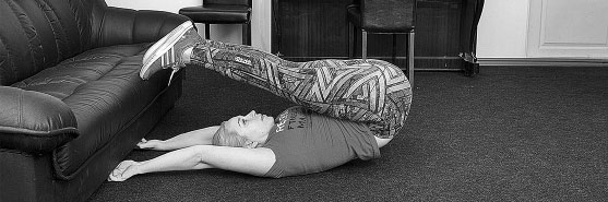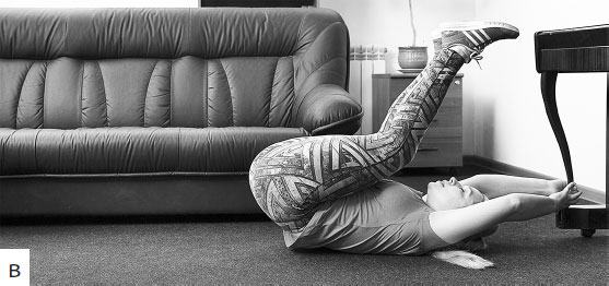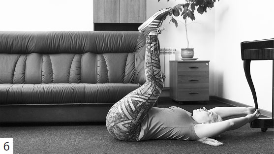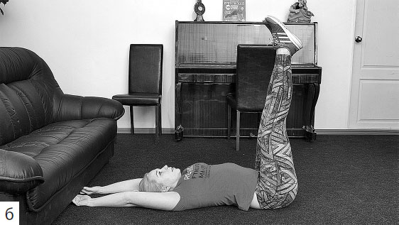 Исходное положение (ИП) лёжа на спине. Руки вытянуты за голову и пальцами держатся за неподвижную опору (шведскую стенку или диван). Постарайтесь поднимать прямые ноги вверх и опускать их за голову, повторив это движение 20 раз.