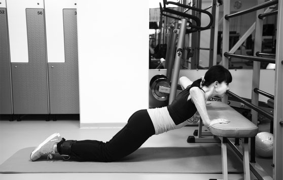 Тест третийНа первый взгляд этот тест прост: нужно отжаться от низкой скамьи, стоя на коленях. Тело абсолютно прямое, выполнить 10 повторений. Существенный нюанс: при каждом отжимании грудь должна касаться скамьи, руки при этом должны быть согнуты в локтевых суставах под острым углом, подбородок максимально поднят, голова смотрит вперёд, фото 3 (а, б).