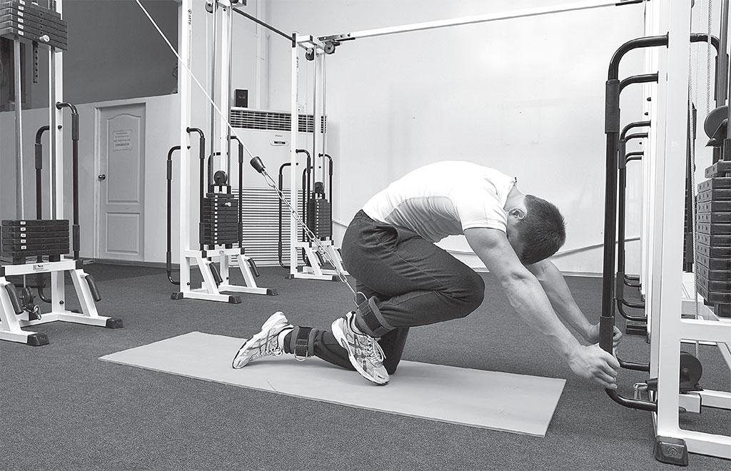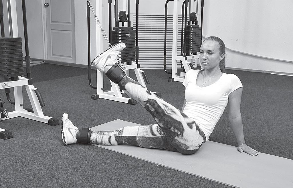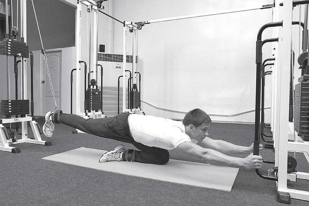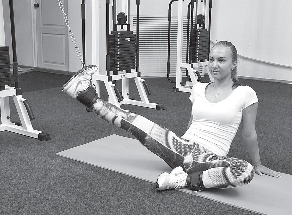 И. П. То же. Нога зафиксирована за верхний блок тренажера.