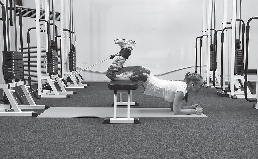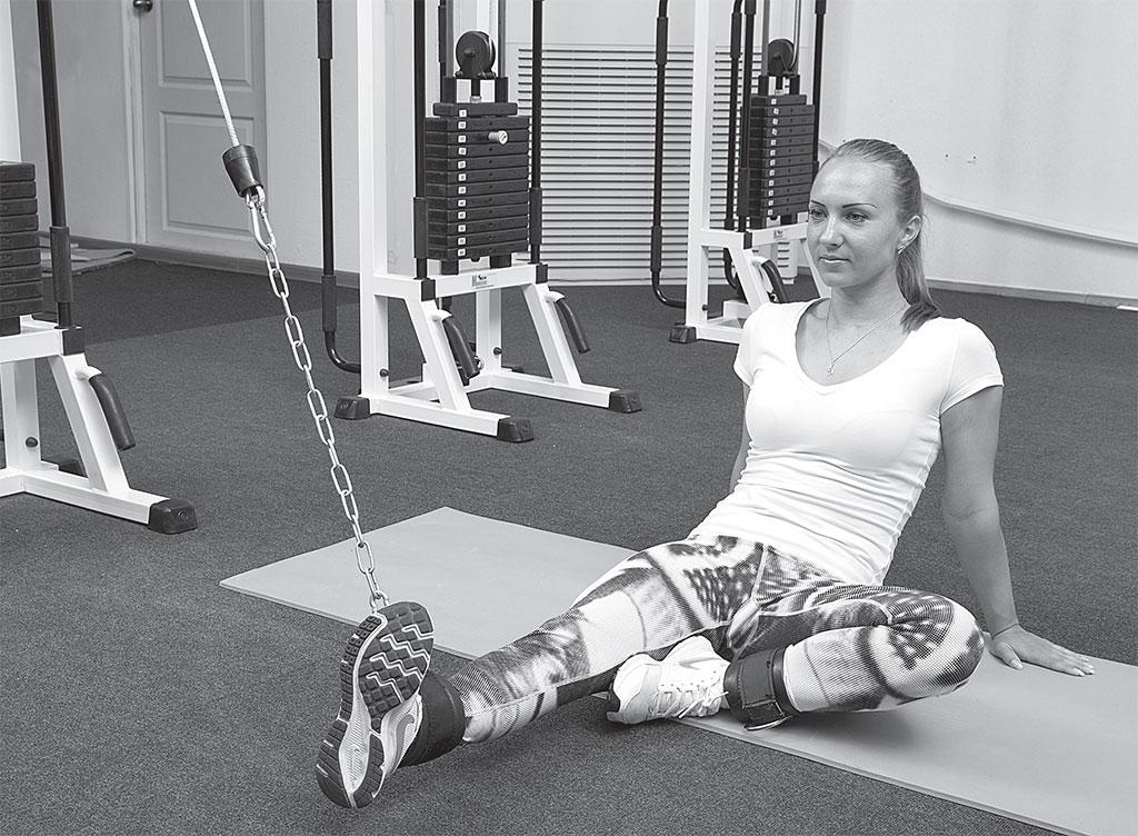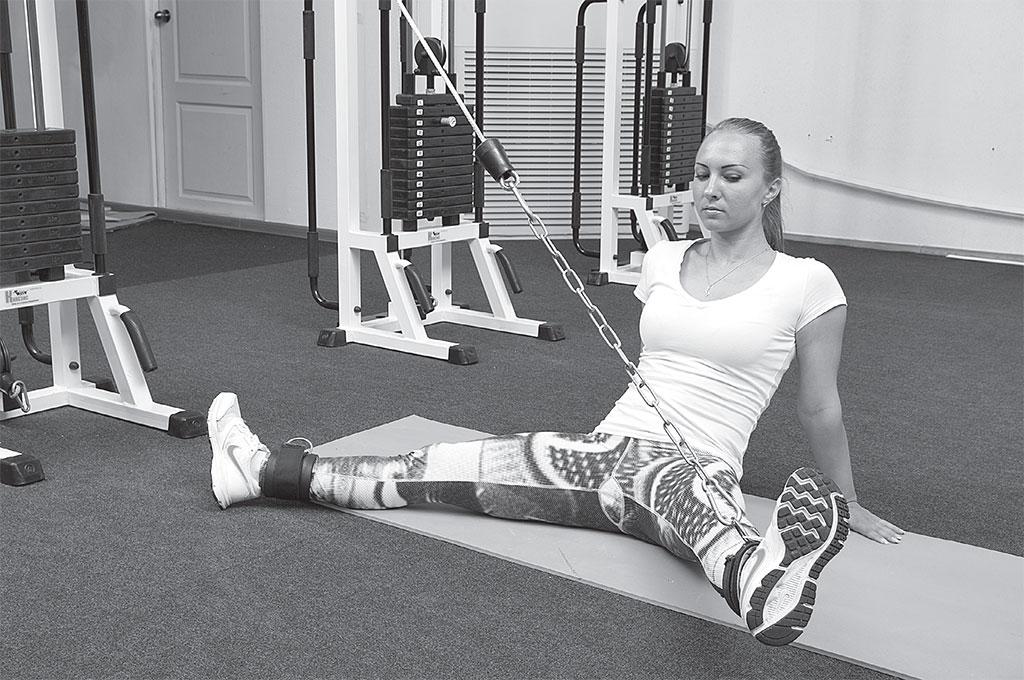 И. П. То же, что в упражнении 2. Отведение выполняется прямой ногой, зафиксированной с помощью манжеты к верхнему блоку тренажера.