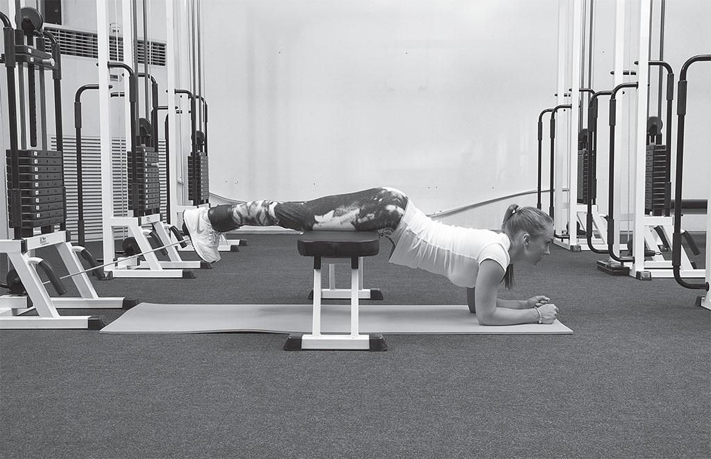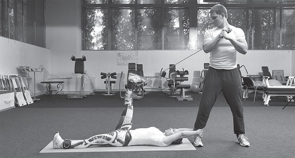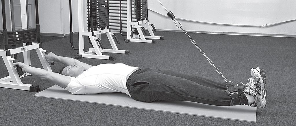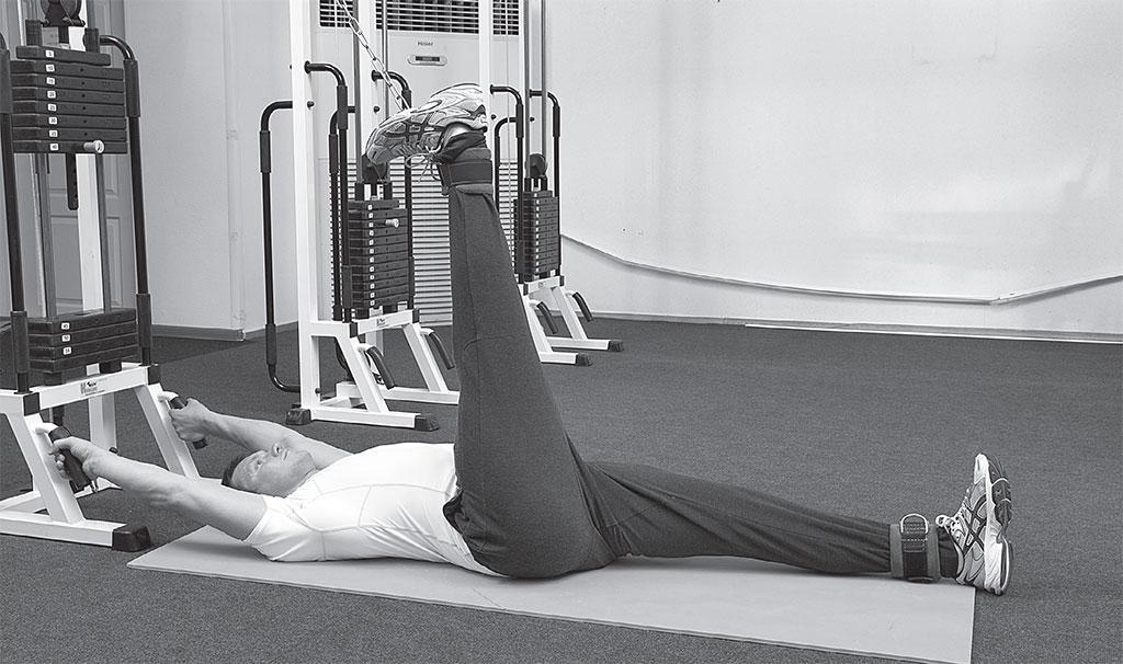 И. П. Лежа на спине, головой к неподвижной опоре, один конец резинового амортизатора зафиксирован за нижнюю треть голени, другой за неподвижную опору в максимально высокой точке, или попросите помочь партнера.