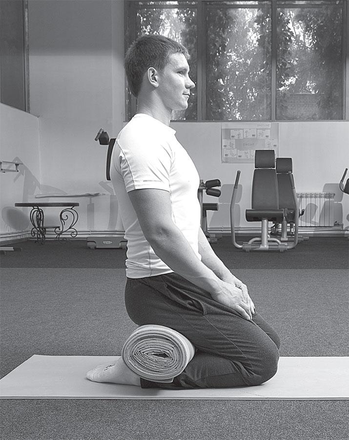 И. П. Сидя на полу (на коврике) на коленях, с валиком (разного диаметра) в подколенной ямке. Сидение от 5 секунд до 5 минут, через болезненность в мышцах передней поверхности бедра и в голеностопном суставе, под который в первые занятия можно также подкладывать валик. Со временем надо стремиться сесть на пятки без валика.