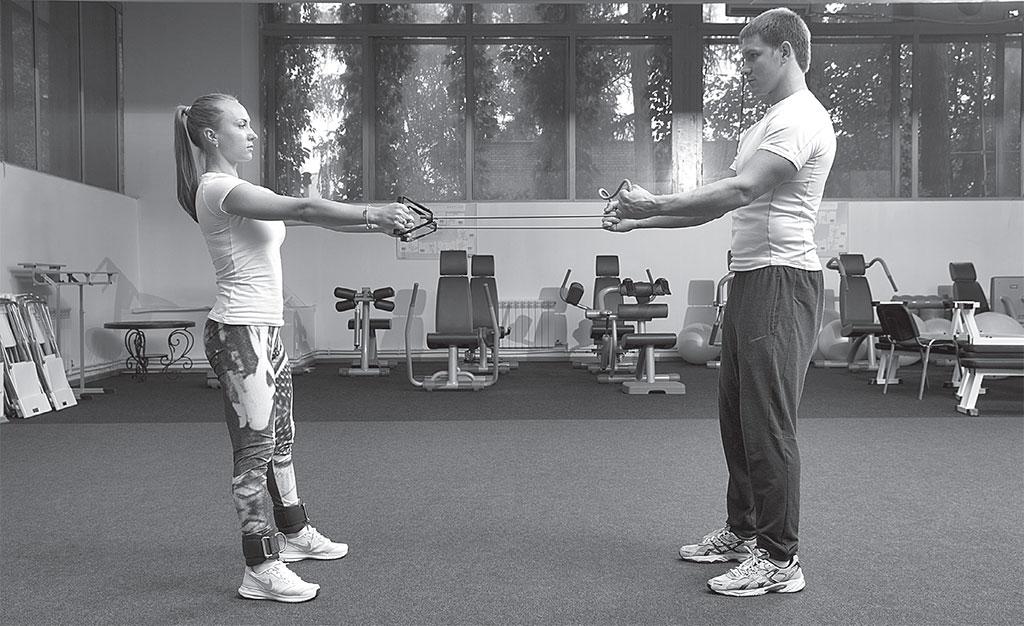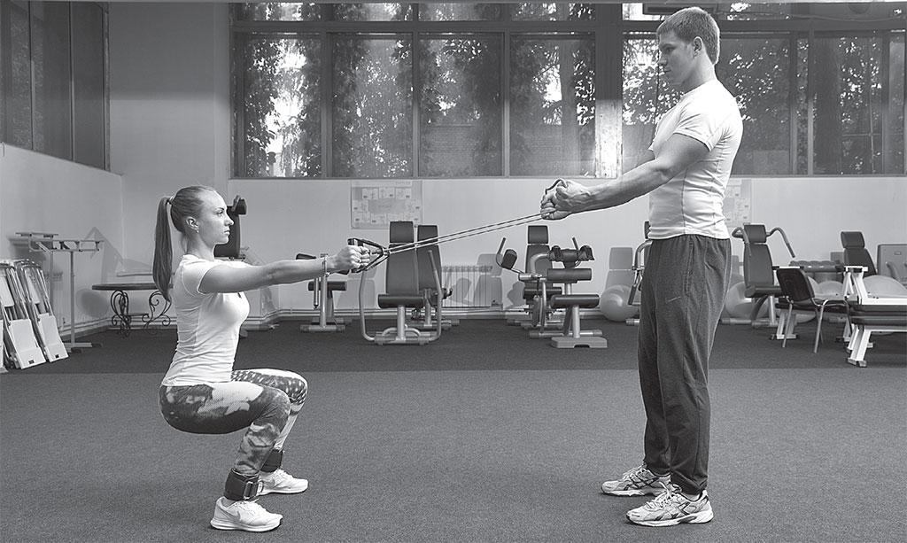 И. П. Стоя лицом к неподвижной опоре, за которую зафиксирован резиновый амортизатор, на таком расстоянии, чтобы амортизатор был натянут. Ноги на ширине плеч. Спина и руки прямые, держатся за перекладину на уровне груди. Стараться первые 10–20 движений приседать не ниже 90 градусов (бедро-пол), сгибая ногу в коленных суставах, спина прямая.