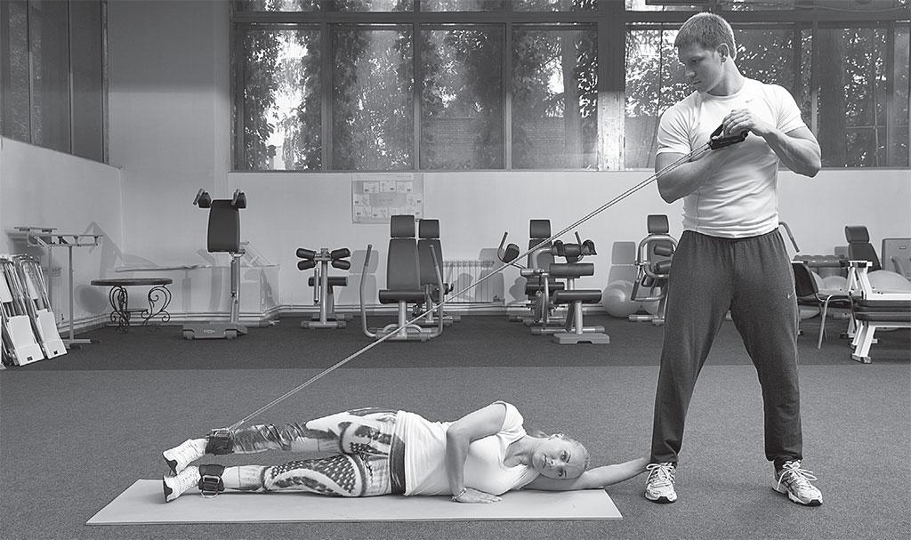И. П. То же, что и в упражнении 2, только выполняется отведение прямой ноги максимально в сторону. Амортизатор необходимо зафиксировать за неподвижную опору или воспользоваться услугами партнера.