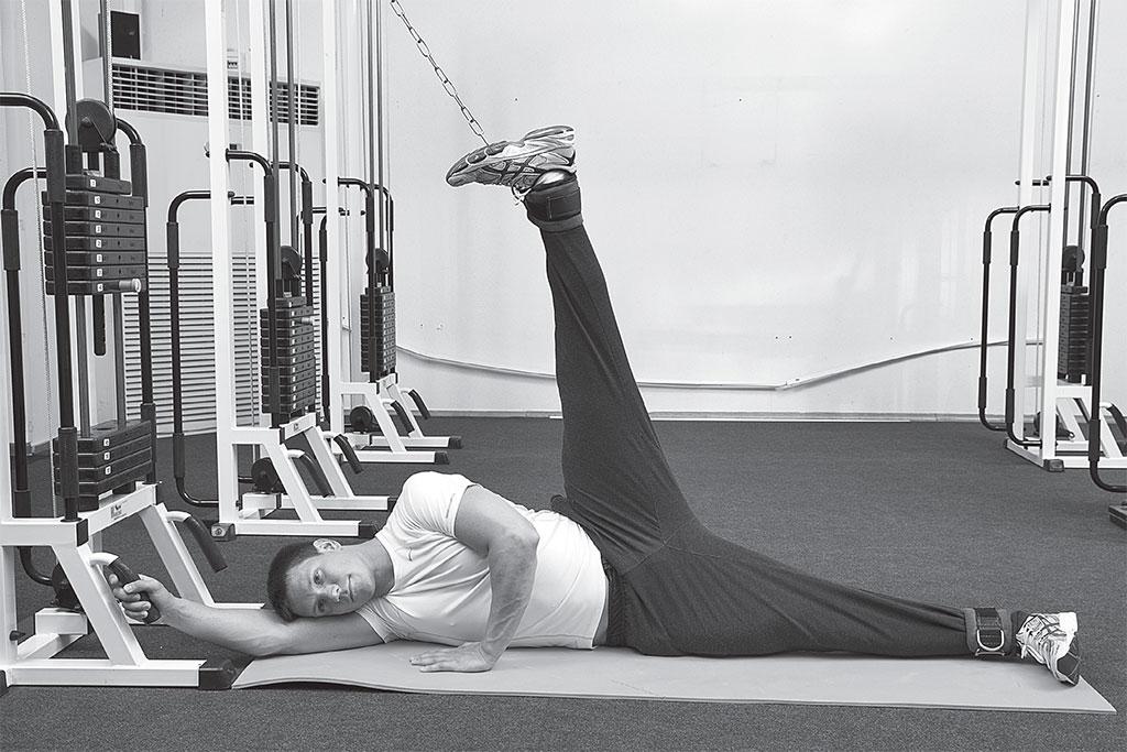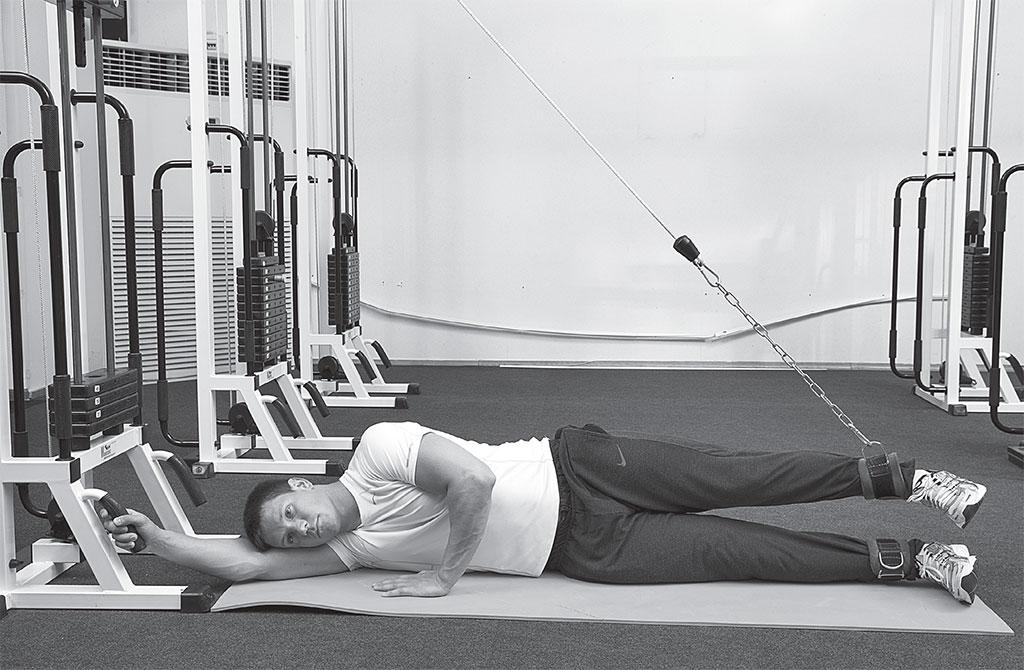И. П. Лежа на боку, головой к стойке, тело прямое. Тяга прямой ногой груза с верхнего блока вниз, к полу.