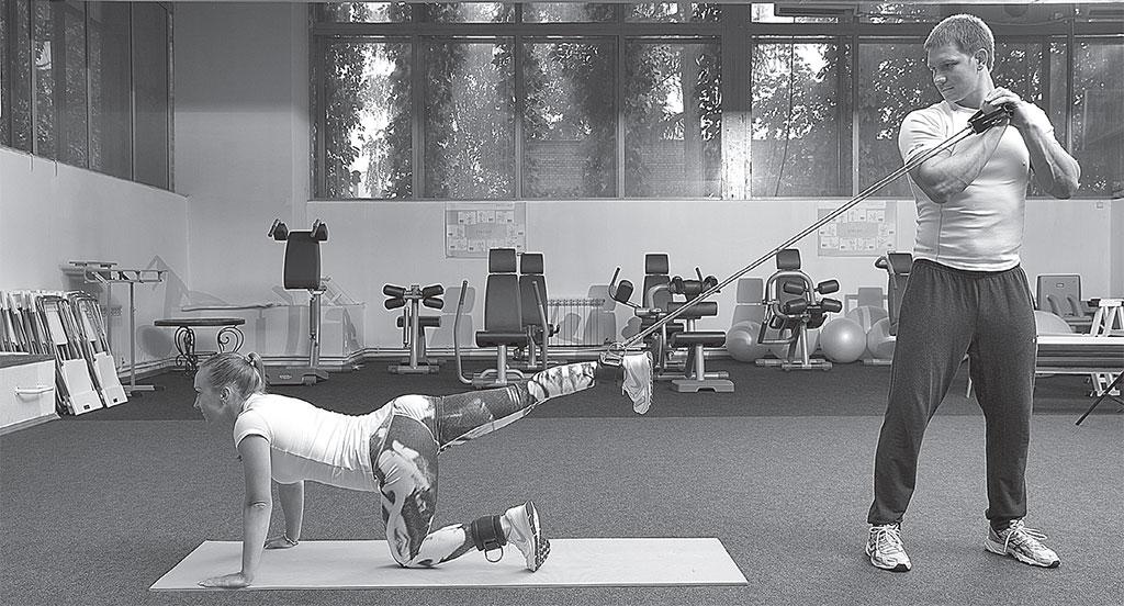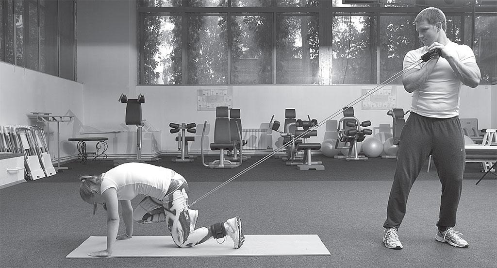 И. П. Стоя на четвереньках, упор руками в пол. Один конец резинового амортизатора зафиксирован в верхней точке комнаты, второй за манжету – к ноге (нижней трети голени). Можно работать с партнером.