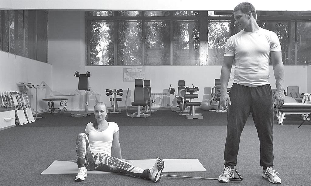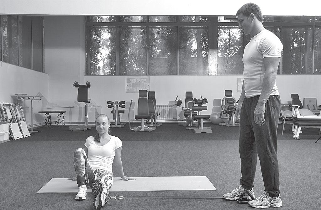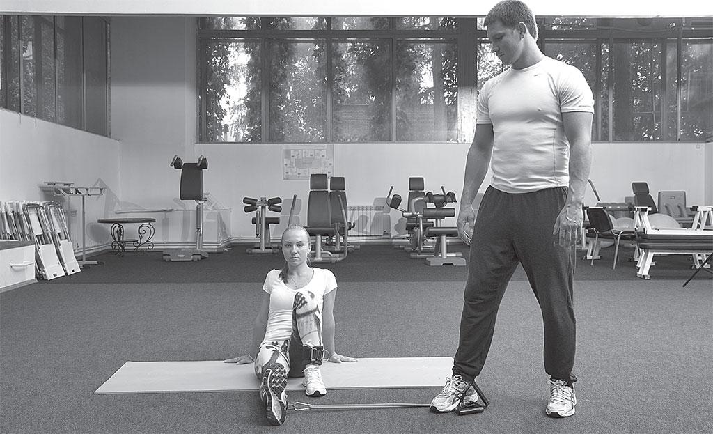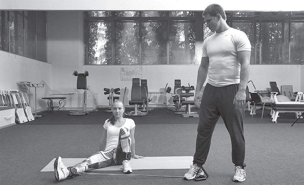 И. П. Сидя на полу, боком к неподвижной опоре (или партнеру), ноги вытянуть вперед. Тяга прямой ногой резинового амортизатора из стороны к центру.