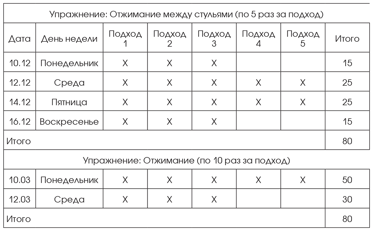 И еще один совет. Для создания мотивации к регулярному выполнению этих упражнений заведите дневник, в котором каждый день отмечайте количество серий выполняемого упражнения. Количество повторений при этом должно быть одинаковым (10–15–20). В последней графе отмечается количество повторений за одно занятие. Это стимулирует…