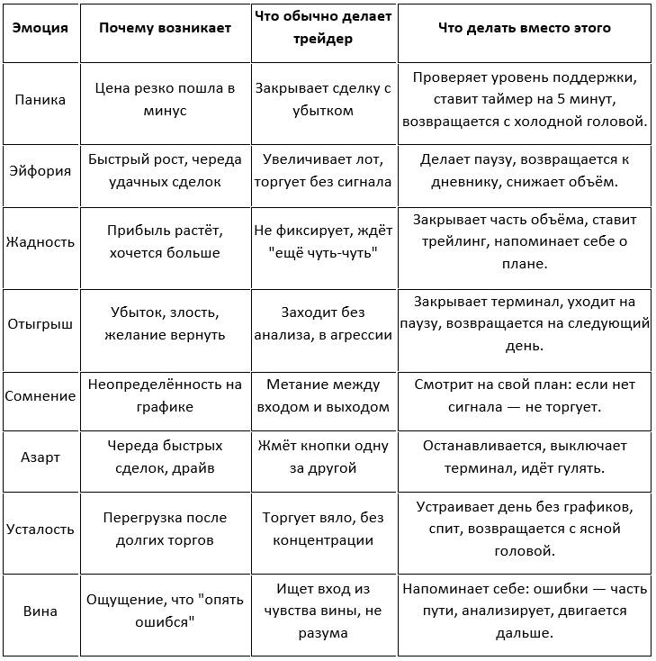 Ты можешь сделать эту таблицу своей практикой. Прямо перед началом торгов пробеги глазами. Отметь галочкой: "Есть у меня это сейчас?" Если да – не входи. Подожди. Отдохни. Сделай два круга вокруг дома. Выпей воды. Поговори сам с собой. Потому что иногда один диалог с самим собой спасает больше, чем десять процентов прибыли.