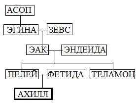 Здесь Асоп – речной бог, Зевс – царь богов и Фетида – морская богиня (Нереида). На этой простейшей схеме не достает родословной бабки Ахилла – Эндеиды, которую добавим на нижнем древе и заодно изобразим связь Ахилла с такими знаменитыми героями Троянской войны, как Агамемнон и Менелай, Тевкр и Аякс Теламонид, Диомед и Нестор. Все герои изображены в пунктирных прямоугольниках