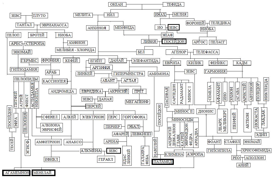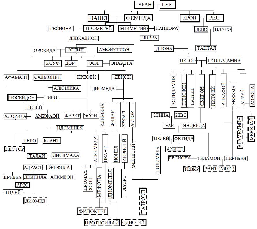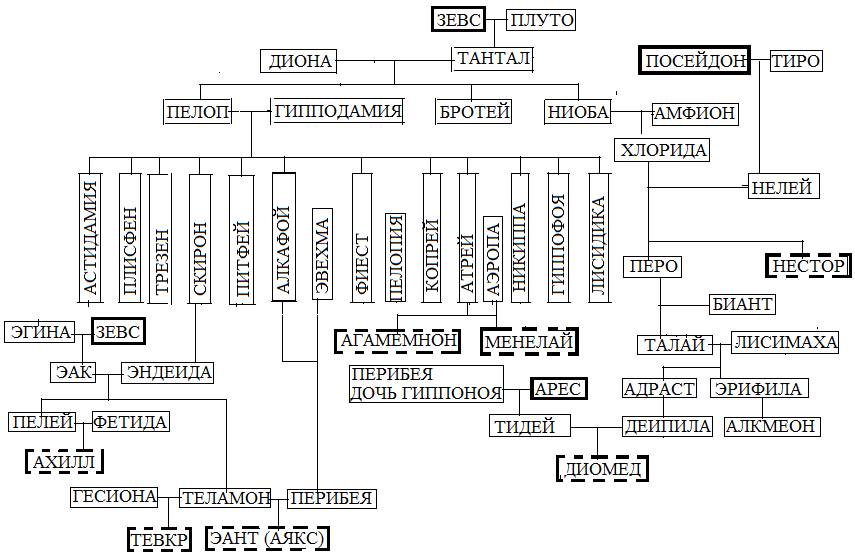 Чтобы показать произвол в генеалогических схемах изобразим древо Ахилла, «переплетающееся» с древом Патрокла и, по возможности, наибольшее число героев Троянской войны. Богов обведем жирными линиями, а героев – воинов жирными пунктирными линиями, это Нестор, Диомед, Филоктет, Протесилай, Одиссей, Патрокл, Ахиллес, Тевкр, Аякс Большой, Агамемнон и Менелай. Из наиболее знаменитых греческих героев на данной генеалогической схеме не хватает Паламеда, Идоменея и Малого Аякса (Оилида).