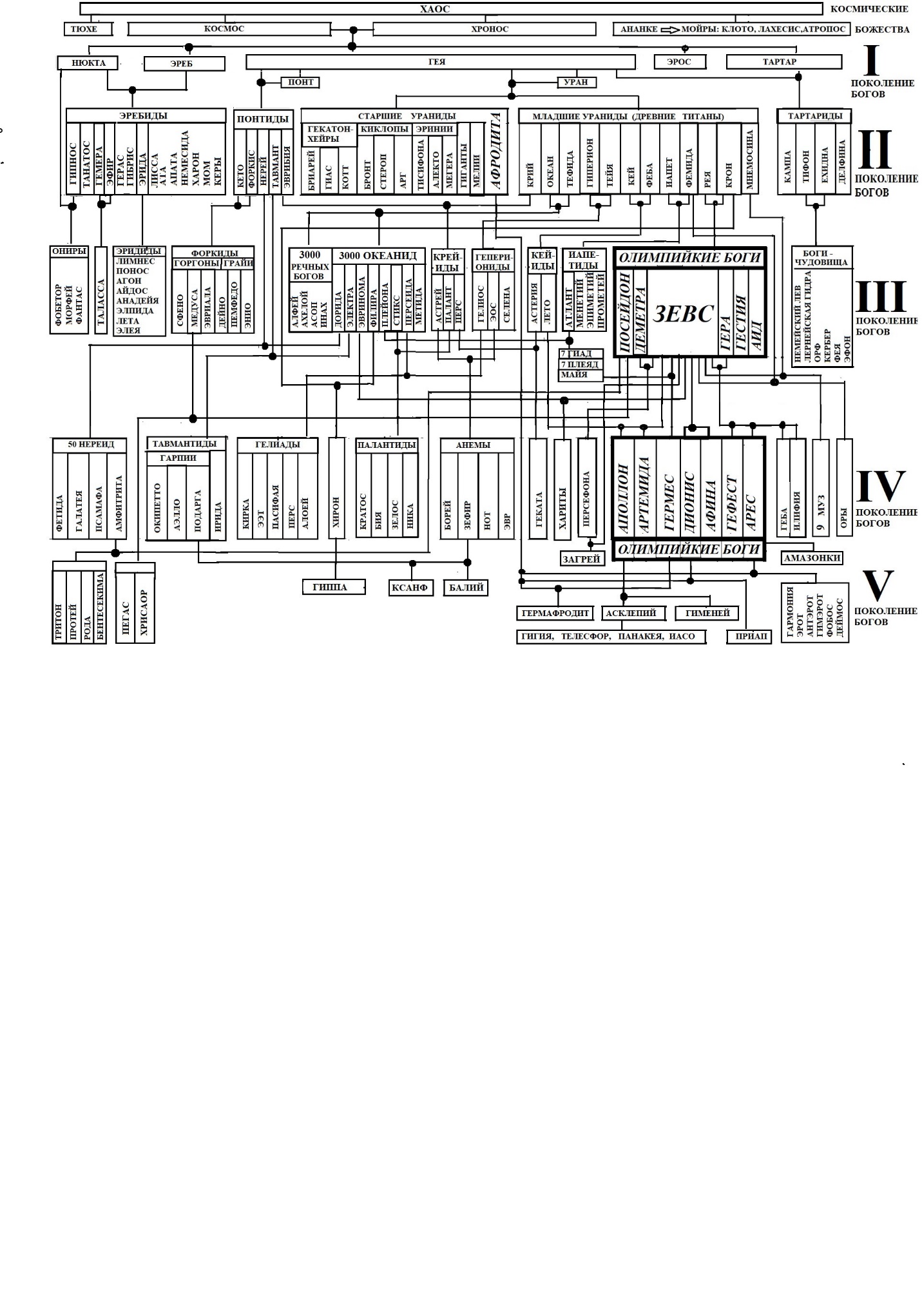 Деление богов по поколениям достаточно условно, так как некоторые из них по отцу и по матери могут принадлежать к разным поколениями. Например, Нереиды по отцу Нерею были божествами III поколения, а по матери Океаниде – они относятся к богам IV поколения.