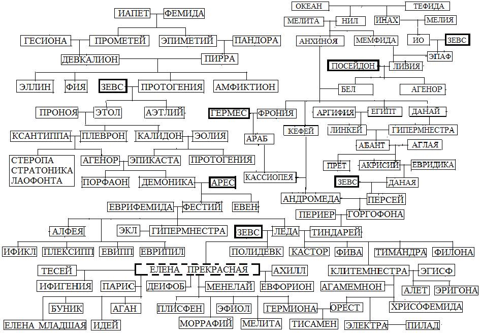 На схеме изображен распространенный вариант генеалогического древа Елены Прекрасной. Как видно, она была рождена царицей Спарты Ледой от царя олимпийских богов, который был к тому же еще и дальним ее предком. Елена Спартанская приходилась так же правнучкой неистовому богу кровавой войны Аресу.