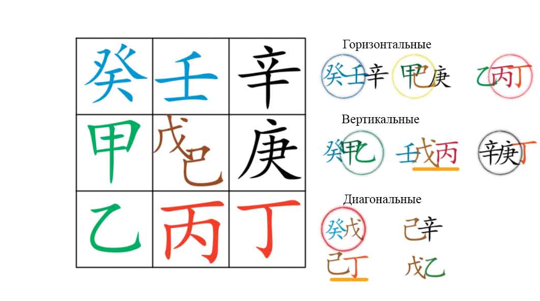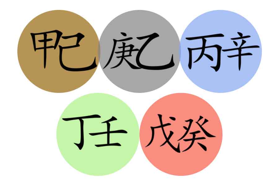 Если посмотреть на этот порядок: 甲-己 – вращение-почва, 乙-庚 – вращение-металл, 丙-辛 – вращение-вода, 丁-壬 – вращение-дерево и 戊-癸 – вращение-огонь, по-прежнему сохраняется порядок взаимоположения пяти стихии: Почва порождает Металл, Металл порождает Воду, Вода порождает Дерево, Дерево порождает Огонь.