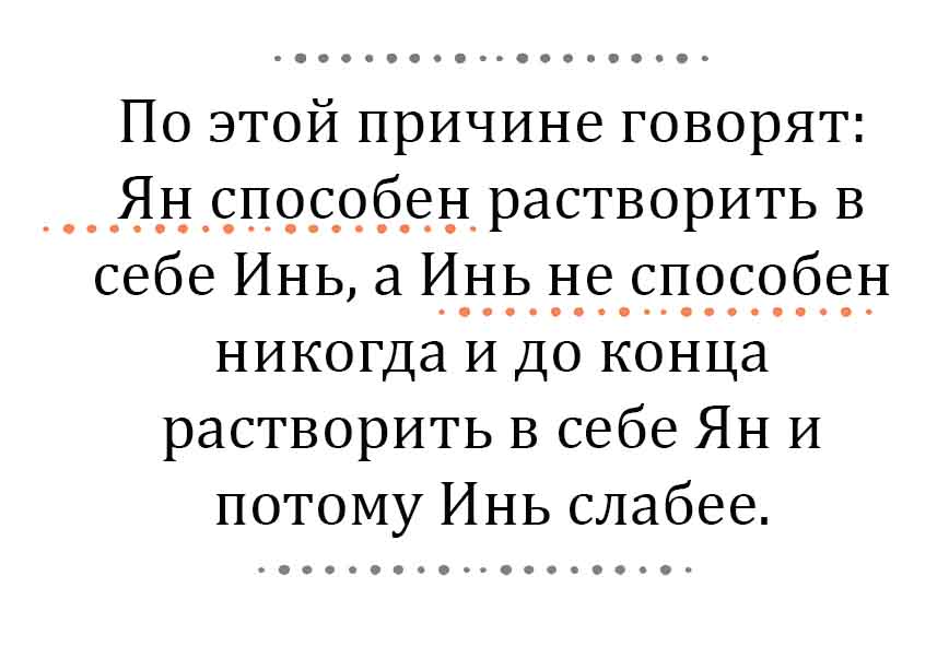 По этой причине говорят: Ян способен растворить в себе Инь, а Инь не способен никогда и до конца растворить в себе Ян и потому Инь слабее.