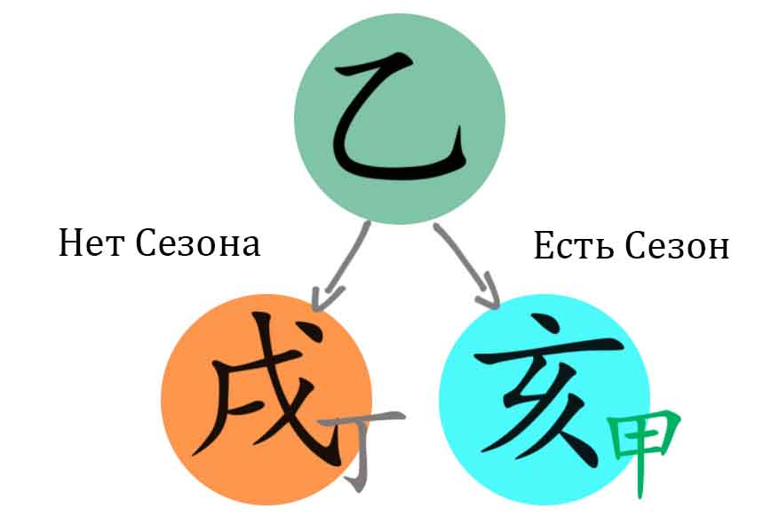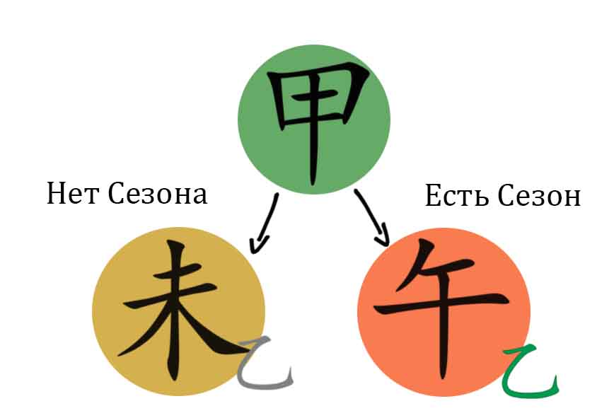 Так иньское Дерево будет порождать, если не сезон, иньский Огонь в Хранилище. Если сезон, а значит имеется Ци, и значит, янское Дерево получает фазу Рождения.