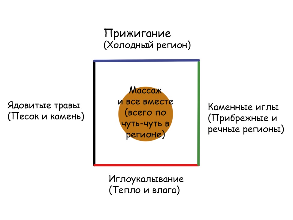 В центре земля ровная, а действует влага. В результате этого небо и земля порождает тьму вещей, потому здесь их больше, чем в других районах. Люди едят разнообразную пищу и не переутомляются. Потому чаще всего у людей случаются параличи, потеря сил, нарушение циркуляции, лихорадки. Лечить эти заболевания лучше всего посредством массажа и психофизических упражнений. Потому подобные практики происходят из центральных земель.