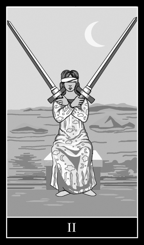Двойка Мечей – очень закрытая карта. На первом плане мы видим крест, на втором – повязку, на третьем – луну/ночь. Практически все в этой карте указывает на разного рода синонимы словам «нет, не надо, стой». Выпадая в раскладе, данный Аркан хочет сообщить человеку, что ему следует повременить с принятием решений, так как еще не время для этого. Обычно причиной тому является недостаток информации для объективной оценки ситуации.